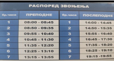 Школско звоно РАСПОРЕД ПРИЈЕМА РОДИТЕЉА, ПЕДАГОГА, ПСИХОЛОГА И ДИРЕКТОРА Loading… Taking too long? Reload document | Open in new tab Преузмите распоред [11.16 KB]